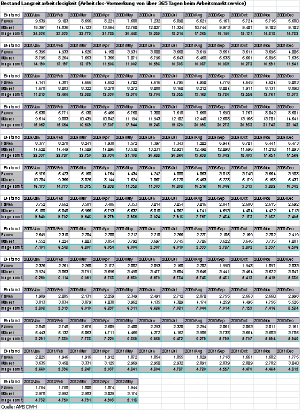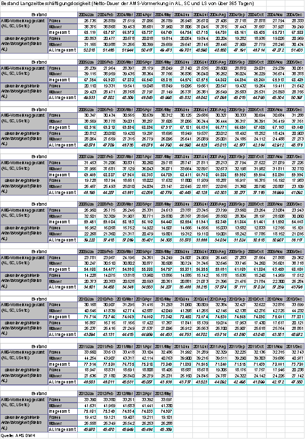 Die folgende Tabelle zeigt alle zum Statistikstichtag in Vormerkung des Arbeitsmarktservice (AMS) befindlichen langzeitbeschäftigungslosen Personen und darunter gesondert die Personengruppe in registrierter Arbeitslosigkeit (als eine Untergruppe aller Personen in AMS-Vormerkung mit Langzeitbeschäftigungslosigkeit). Eine validierte Datenbasis liegt hierfür seit Jänner 2004 vor. Eine Rückrechnung bis in das Jahr 2000 ist aus technischen Gründen nur erschwert möglich und wäre mit erheblichem Aufwand verbunden.