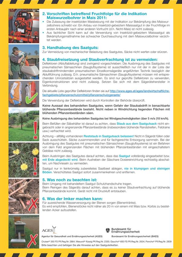 In den Anwendungsvorschriften der AGES für die Aussaat von Insektizid-gebeiztem Mais- und Kürbissaatgut 2011 heißt es u.a.: „Tierische Schädlinge (Maiswurzelbohrer und Drahtwurm) bedrohen den Maisanbau und erfordern effektive Gegenmaßnahmen. Die Beizung stellt bei Einhaltung der Anwendungsvorschriften eine sehr effektive und auch umweltverträgliche Pflanzenschutzmaßnahme dar.“