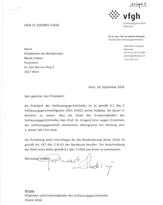 Schreiben des Präsidenten des Verfassungsgerichtshofes betreffend die Mitteilung, dass die Stelle des Ersatzmitgliedes des Verfassungsgerichtshofes Hon.-Prof. Dr. Irmgard Griss wegen Erreichens der Altersgrenze mit Wirkung 1. Jänner 2017 frei wird und zur Erstattung eines Vorschlages für die Neubesetzung dieser Stelle gemäß Art. 147 Abs. 2 B-VG der Bundesrat berufen ist: