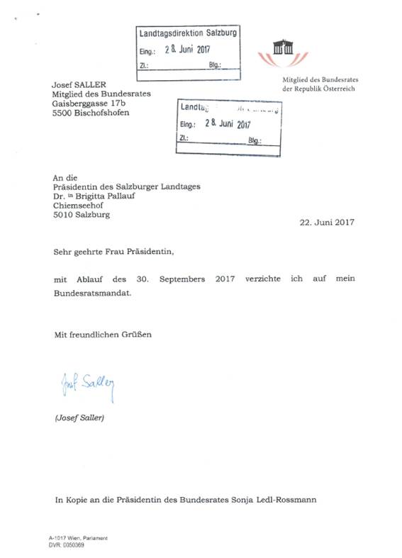 Schreiben an den Salzburger Landtag betreffend Mandatsverzicht: