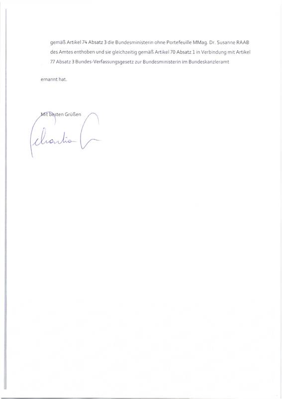 Schreiben des Bundeskanzlers Sebastian Kurz betreffend Amtsenthebung der Bundesministerinnen ohne Portefeuille Mag. Karoline Edtstadler, Mag. (FH) Christine Aschbacher und MMag. Dr. Susanne Raab bei gleichzeitiger Ernennung zu Bundesministerinnen im Bundeskanzleramt durch den Bundespräsidenten ............................................................................................................................... 36