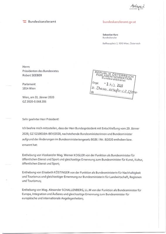 Schreiben des Bundeskanzlers Sebastian Kurz betreffend Amtsenthebung beziehungsweise Ernennung von Mitgliedern der Bundesregierung aufgrund der Änderungen im Bundesministeriengesetz BGBl. I Nr. 8/2020 durch den Bundespräsidenten ..................................................................... 38