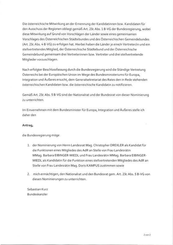 Schreiben des Bundeskanzlers Sebastian Kurz gemäß Art. 23c Abs. 5 B-VG betreffend Nominierung eines Mitglieds und eines stellvertretenden Mitglieds in den Ausschuss der Regionen .......... 40