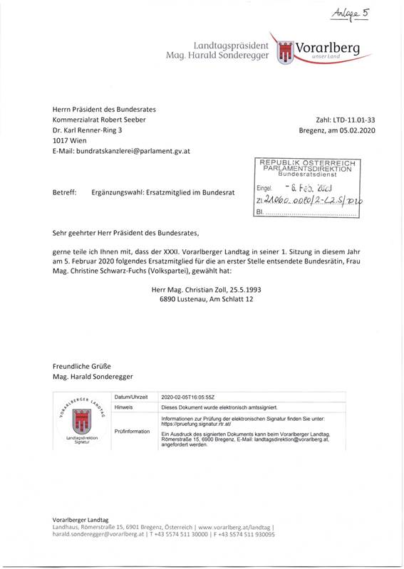 Schreiben des Präsidenten des Vorarlberger Landtages betreffend Wahl eines Ersatzmitglieds des Bundesrates ................................................................................................................... 49