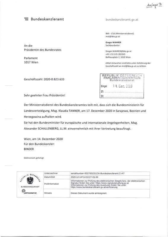 Schreiben des Bundeskanzleramtes betreffend Aufenthalt von Mitgliedern der Bundesregierung in einem anderen Mitgliedstaat der Europäischen Union ........................................... 13, 14