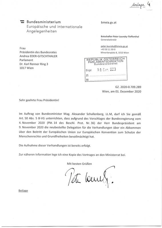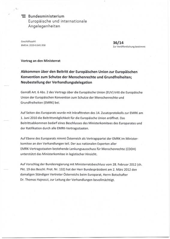 Schreiben des Generalsekretärs des Bundesministeriums für europäische und internationale Angelegenheiten gemäß Art. 50 Abs. 5 B-VG betreffend Erteilung der Vollmacht zur Aufnahme von Verhandlungen über ein Abkommen über den Beitritt der Europäischen Union zur Europäischen Konvention zum Schutze der Menschenrechte und Grundfreiheiten durch den Bundespräsidenten ............................................................................................................................... 15