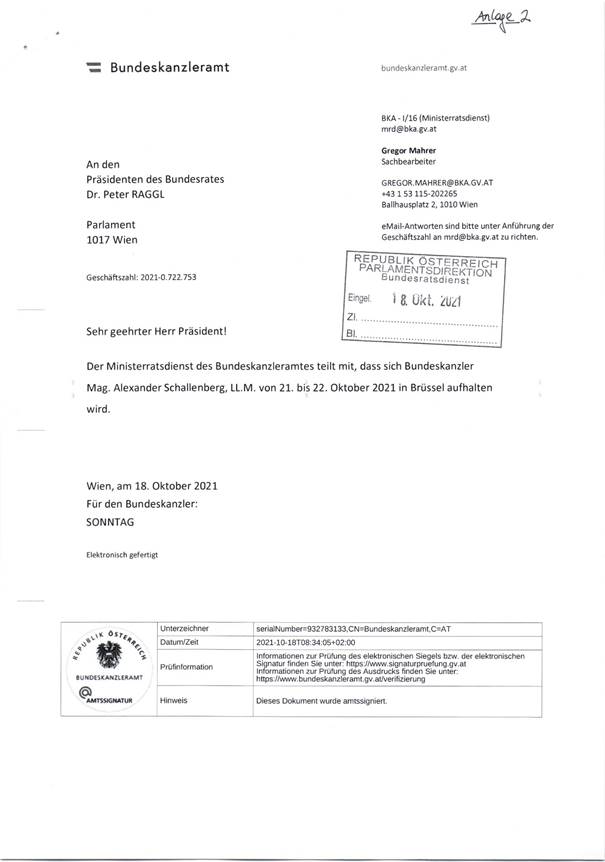 Schreiben des Ministerratsdienstes betreffend den Aufenthalt von Herrn Bundeskanzler Mag. Alexander Schallenberg, LL.M. am 21. und 22. Oktober 2021 in Brüssel (Anlage 2)