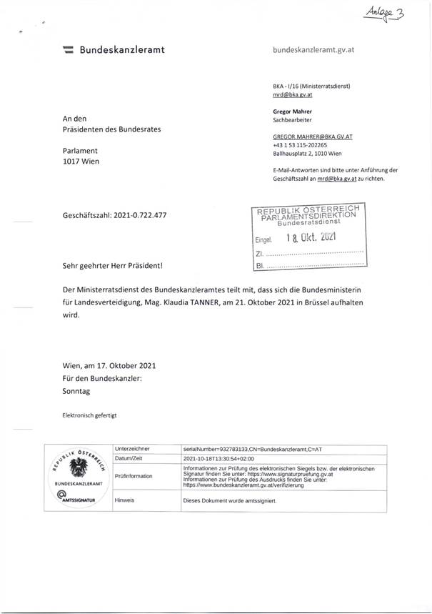 Schreiben des Ministerratsdienstes betreffend den Aufenthalt von Frau Bundesministerin für Landesverteidigung Mag. Klaudia Tanner am 21. Oktober 2021 in Brüssel (Anlage 3)
