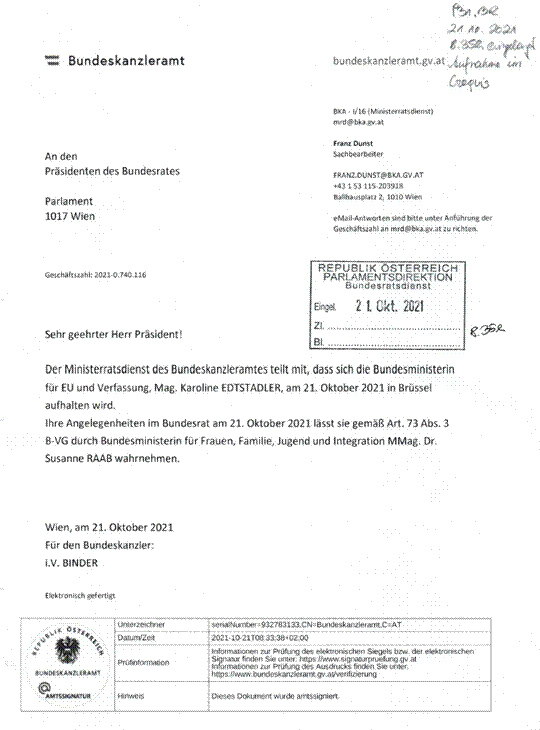 Weiters und soeben eingelangt ist ein Schreiben des Ministerratsdienstes des Bundeskanzleramtes betreffend Aufenthalt der Bundesministerin für EU und Verfassung Karoline Edtstadler am 21. Oktober 2021 in Brüssel bei gleichzeitiger Beauftragung von Bundesministerin für Frauen, Familie, Jugend und Integration Susanne Raab mit ihrer Vertretung.