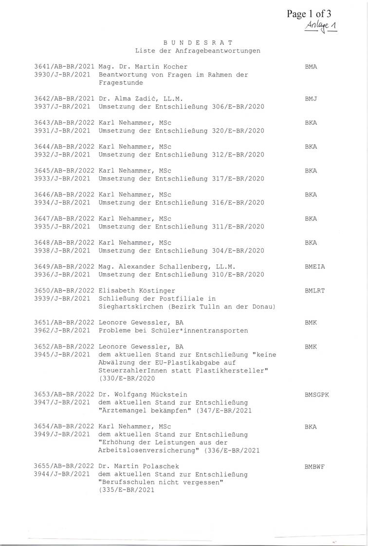 Eingelangt ist der Entschließungsantrag der Bundesräte Ingo Appé, Kolleginnen und Kollegen betreffend „die Erarbeitung geeigneter Strategien für Long-Covid-Patient*innen, die an Ihren angestammten Arbeitsplatz so rasch als möglich zurückkehren wollen“, der dem Gesundheitsausschuss zugewiesen wird.