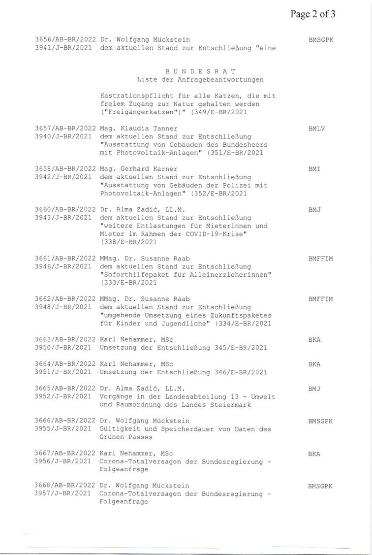 Eine letzte Sache noch, das ist mehr ein allgemeiner Hinweis: Das Bundesministerium ist zuständig für Soziales, Konsumentenschutz, für Gesundheit und auch für die Pflege. Sie haben mehrfach angekündigt, dass Sie etwas in der Pflege voranbringen wollen. Ich weiß, mit der ÖVP ist das nicht einfach, aber Sie müssen ins Liefern kommen. Die Situation wird nicht leichter, sie wird schwieriger. Long Covid ist ein Faktor. Eine Kollegin aus der grünen Bundesratsfraktion hat gemeint, es gebe schon so tolle Konzepte zu Long Covid und den betroffenen PatientInnen. Ich kenne diese nicht, auch die Gesundheitsbehörden kennen sie nicht. Da muss man aktiv werden und das liegt in Ihrer Verantwortung. Wenn das nicht passiert, werden Sie dieser Verantwortung nicht gerecht.