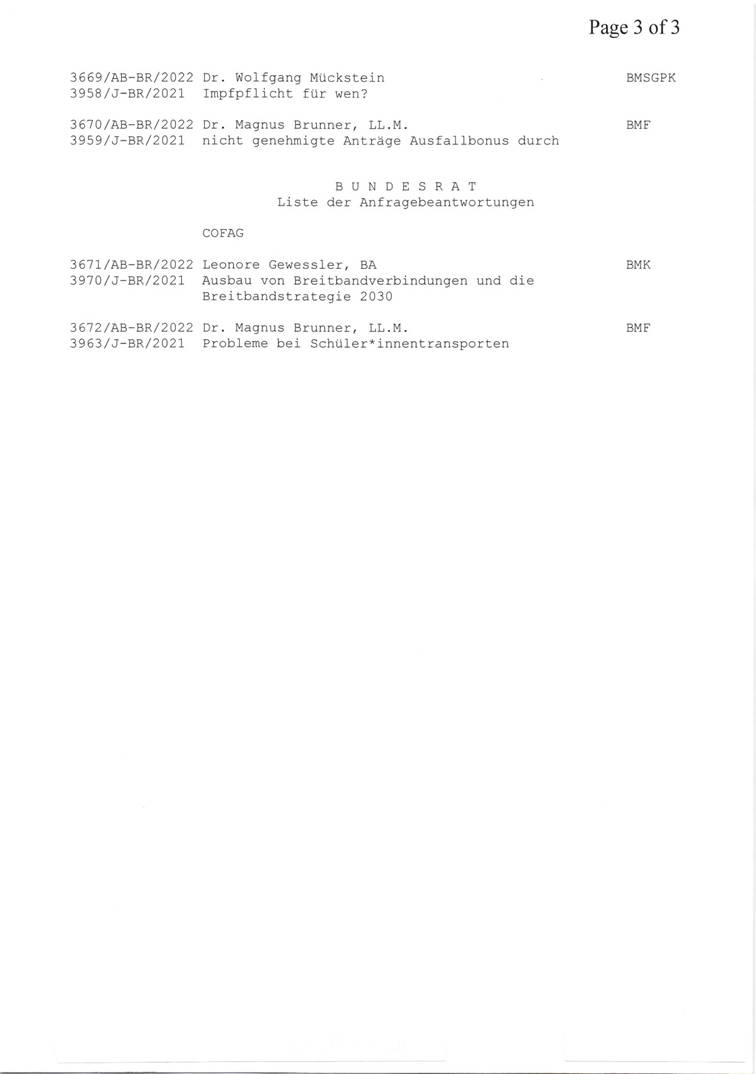 Die Einberufung der nächsten Sitzung des Bundesrates wird auf schriftlichem Weg erfolgen. Als Sitzungstermin wird Mittwoch, 9. März 2022, 9 Uhr, in Aussicht genommen.