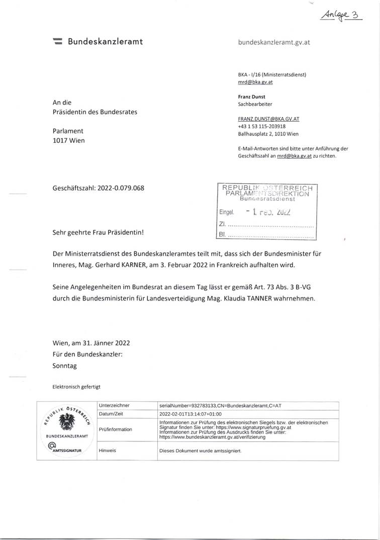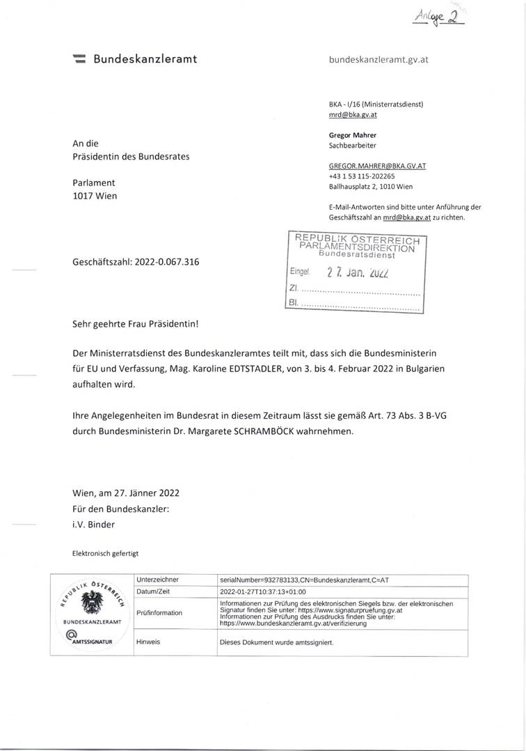 Schreiben des Bundeskanzleramtes betreffend Aufenthalt von Mitgliedern der Bundesregierung in einem anderen Mitgliedstaat der Europäischen Union 62, 63, 64