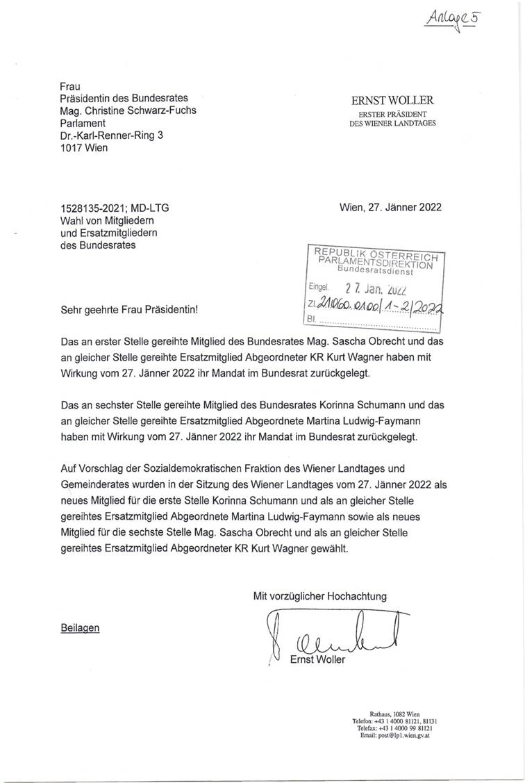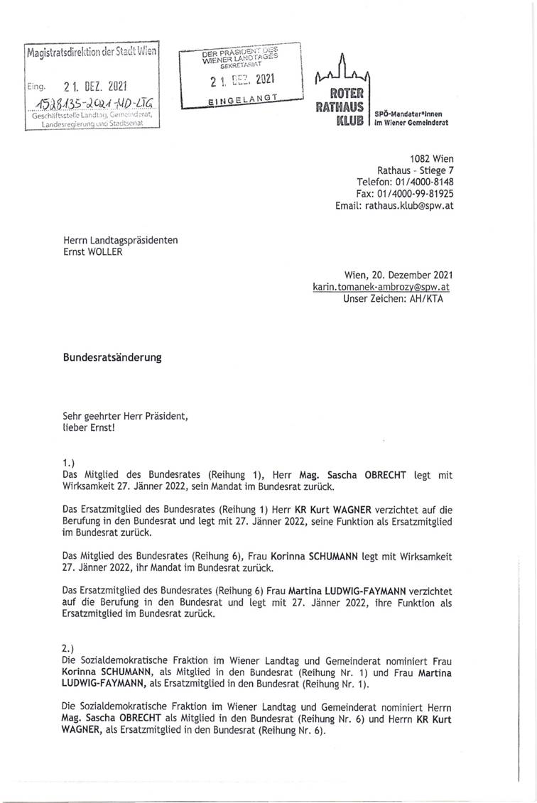 Schreiben des Präsidenten des Wiener Landtages betreffend Mandatsverzicht der BundesrätInnen Mag. Sascha Obrecht und Korinna Schumann sowie Wahl von Mitgliedern und Ersatzmitgliedern des Bundesrates ......................................... 65
