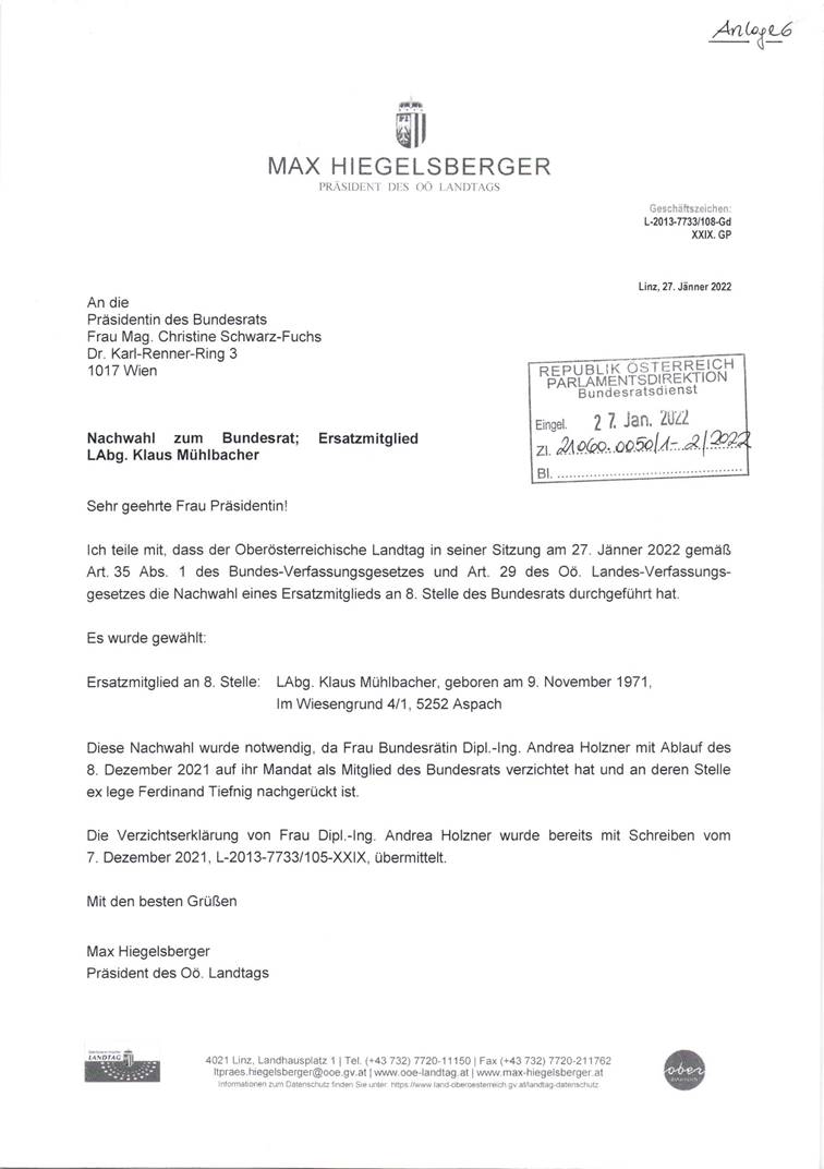 Schreiben des Präsidenten des Oberösterreichischen Landtages betreffend Wahl eines Ersatzmitgliedes des Bundesrates ................................................................. 73
