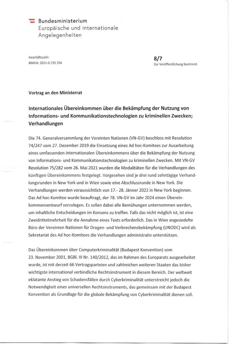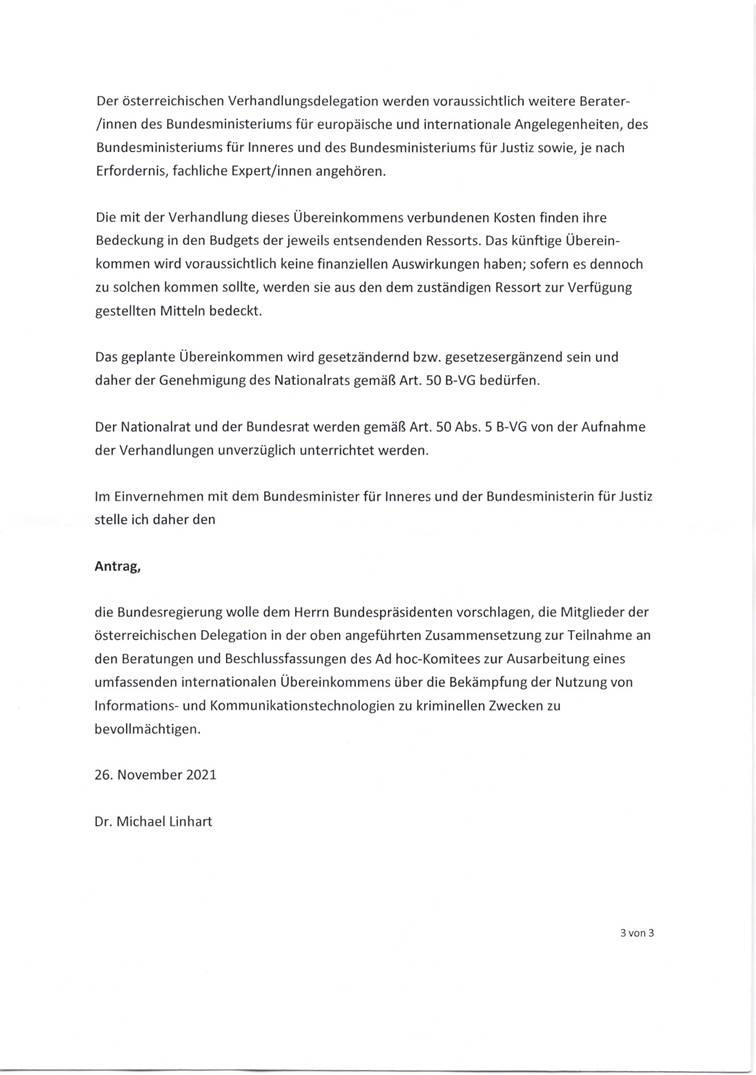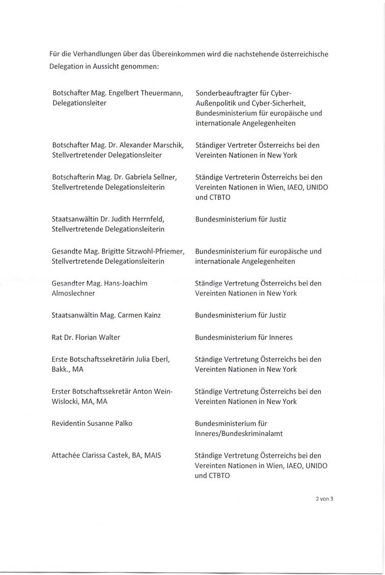 Schreiben des Generalsekretärs des Bundesministeriums für europäische und internationale Angelegenheiten gemäß Art. 50 Abs. 5 B-VG betreffend Erteilung der Vollmacht zur Aufnahme von Verhandlungen über ein Internationales Übereinkommen über die Bekämpfung der Nutzung von Informations- und Kommunikationstechnologien zu kriminellen Zwecken durch den Herrn Bundespräsidenten 74