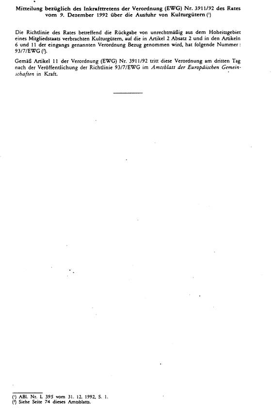 3. Aus dem Sinn und der gesamten Zielrichtung der Richtlinie ergibt sich, daß die von dieser als Voraussetzung für eine Entschädigung verlangte „erforderliche Sorgfalt beim Erwerb“ nur auf die Zulässigkeit der Verbringung des Kulturguts aus dem ersuchenden Mitgliedstaat gerichtet sein kann; sie steht mit dem „guten Glauben“ an das Eigentum desjenigen, von dem das Kulturgut erworben wurde, nicht unmittelbar im Zusammenhang. Unter der „erforderlichen Sorgfalt“ versteht die Richtlinie wohl eine von der konkreten Person des Erwerbers losgelöste „objektive Bedingung“, die aber doch von den näheren Umständen des Erwerbs, etwa der Art des Kulturguts, dem bezahlten Preis, dem Ort des Erwerbs, dem „Ruf“ des Verkäufers (Händler, Versteigerungshaus aber auch Privatmann) usw. abhängen wird.