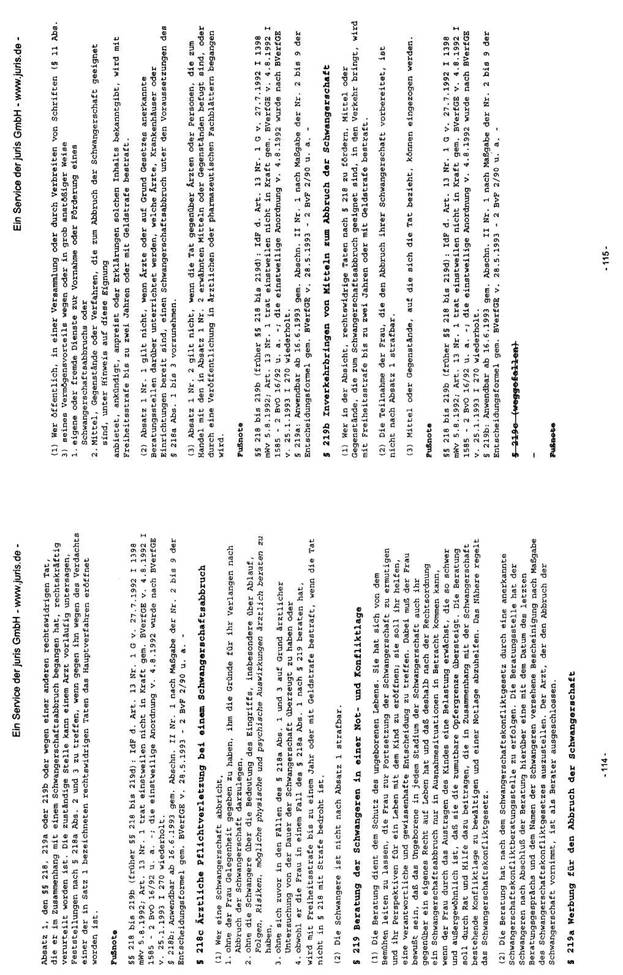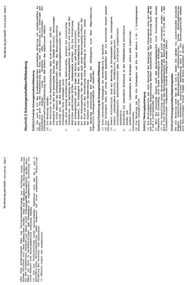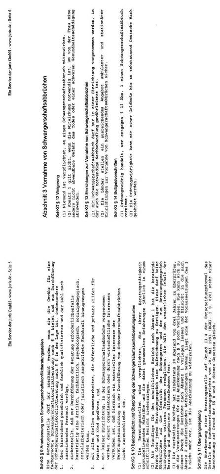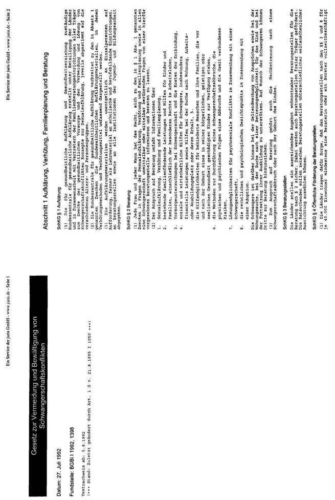 In der Bundesrepublik Deutschland liegt eine, in den Grundzügen mit der österreichischen vergleichbare Rechtslage vor. Mit dem großen Unterschied, dass dort in den §§ 218a ff dStGB die Modalitäten dieser „vorhergehenden ärztlichen Beratung" konkretisiert werden. Mit dem im Jahre 1992 verabschiedeten „Gesetz zur Vermeidung und Bewältigung von Schwangerschaftskonflikten" wurde ein bundesweites Netz an Schwangerschaftskonfliktberatungsstellen errichtet und Vorgaben über den Inhalt der Beratung festgelegt. Laut § 219 Abs. 1 dStGB dient die Beratung dem Schutz des ungeborenen Lebens. Sie hat sich von dem Bemühen leiten zu lassen, die Frau zur Fortsetzung der Schwangerschaft zu ermutigen und ihr Perspektiven für ein Leben mit dem Kind zu eröffnen; sie soll ihr helfen, eine verantwortliche und gewissenhafte Entscheidung zu treffen.