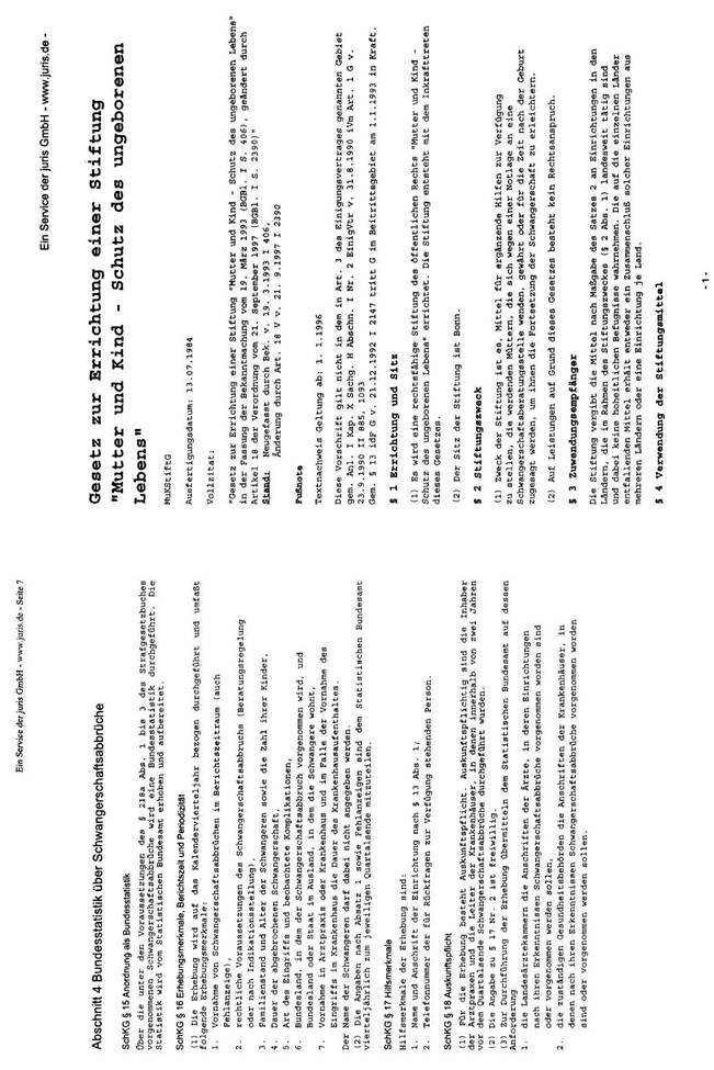 Mit dem im Jahre 1984 verabschiedeten „Gesetz zur Errichtung einer Stiftung „Mutter und Kind - Schutz des ungeborenen Lebens"" wurden überdies finanzielle Mittel vorgesehen, die für ergänzende Hilfen zur Verfügung gestellt werden. Damit sollen werdenden Müttern, die sich wegen einer Notlage an eine Schwangerschaftsberatungsstelle wenden, Mittel gewährt oder für die Zeit nach der Geburt zugesagt werden, um ihnen die Fortsetzung der Schwangerschaft zu erleichtern.