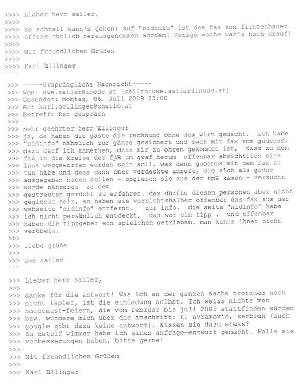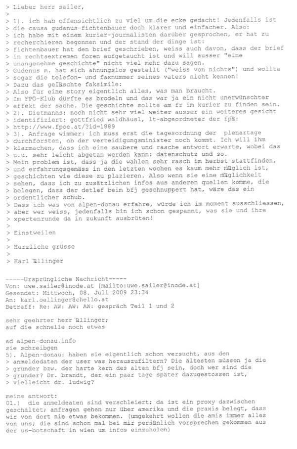 Der angeführte Mail-Verkehr des Abgeordneten Öllinger mit Herrn Uwe Sailer, seines Zeichens Kriminalbeamter, ehemaliger Gruppenführer der IT-Gruppe im Landeskriminalamt Oberösterreich und Gerichtssachverständiger für das Fachgebiet forensische Datensicherung, spiegelt die Versuche Nationalratsabgeordnete der FPÖ, wie zum Beispiel die Nationalratsabgeordneten Strache und Fichtenbauer, und deren Mitarbeiter sowie politische Funktionäre der FPÖ zu bespitzeln und auszuspionieren wider.