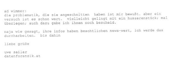 · Für den Untersuchungsausschuss gilt es als erwiesen, dass Uwe Sailer mehrfach dienstlich erworbenes Wissen an den Abgeordneten der Grünen, Karl Öllinger, weitergegeben hat und damit Amtsmissbrauch begangen hat.