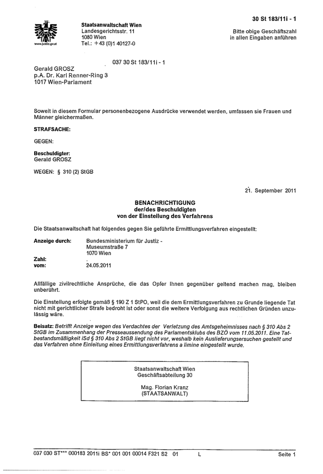 Im September 2011 erhielt der Anfragestellt folgende Mitteilung der Staatsanwaltschaft Wien: