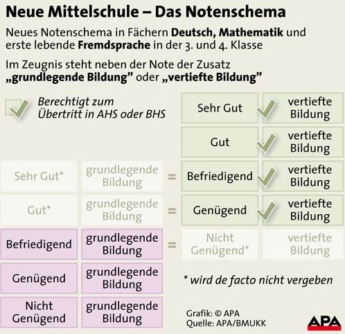 An Neuen Mittelschulen wird der Unterricht in den Fächern Deutsch, Mathematik und lebende Fremdsprache ab der 3. Klasse/7.Schulstufe differenziert angeboten. In der Leistungsbeurteilung spiegelt sich das in einer siebenstufigen Notenskala wider, die sich teilweise überschneidet.