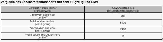 Täglich werden tausende Tonnen Lebensmittel aus Übersee nach Europa gebracht. Wie aus den Tabellen ablesbar, sind für die Umwelt die Flugtransporte am bedenklichsten. Ware aus Übersee wird größtenteils zwar mit dem Schiff transportiert, wo der geringste CO2-Ausstoß pro Kilometer stattfindet, jedoch sind die Wegstrecken vergleichsweise lang: