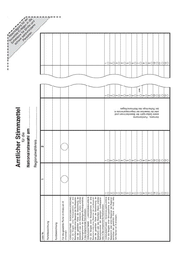 · Einführung einer Abschrägung des amtlichen Stimmzettels samt entsprechender Kennzeichnung der Abschrägung (ermöglicht erleichtertes Einlegen des Stimmzettels in die Schablone) (vgl. Art. 1 Z 79 und 117, § 75 Abs. 2 sowie Anlage 6 NRWO);