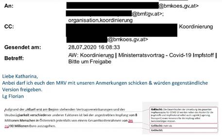 Es war also ein klarer Auftrag an die ausführenden BeamtInnen, Impfungen ausschließlich im Rahmen von 200 Mio. Euro zu beschaffen. Die Folge: im Herbst 2020 wurde „freiwillig“ auf den Kauf von mehreren Millionen Impfdosen verzichtet.