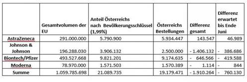 Allein beim Impfstoff von Johnson&Johnson hat Österreich auf die Lieferung von 1,5 Mio. Dosen verzichtet. Bei Johnson&Johnson, wo eine Impfdosis für eine Vollimmunisierung ausreicht, bedeutet das also auch potentiell 1,5 Millionen zusätzlich geimpfter Personen.