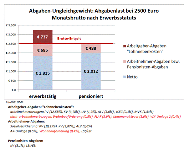 Was zudem für Lohnnebenkostensenkungen spricht, ist das extreme Abgaben-Ungleichgewicht zwischen Arbeitnehmer_innen und Pensionist_innen, aber auch zwischen Vollzeit-Arbeitnehmer_innen und Teilzeit-Arbeitnehmer_innen oder zwischen Arbeitnehmer_innen und Selbstständigen/Bauern. Arbeitnehmer_innen tragen die Hauptlast des Sozialstaates, erst mit der Pensionierung fällt ein Großteil der Abgaben weg (PV, ALV, Wohnbauförderung, FLAF, Kommunalsteuer,...). Arbeitnehmer_innen stemmen aber auch beispielsweise die Beiträge für die Wohnbauförderung alleine. Auch zwischen Vollzeit-Arbeitskräften und Teilzeit-Arbeitskräften ist es durch die Beitragsstaffelungen in der Krankenversicherung und Arbeitslosenversicherung zur Benachteiligung der drei Millionen Vollzeitarbeitskräfte gekommen. Hinzu kommt die zu steile Steuerprogression, bei der seit Jahren vorwiegend die unteren Steuerstufen gesenkt werden und auf die oberen Stufen vergessen wird. Daher braucht es eine bessere Verteilung der Abgaben. Vor allem bei den nicht-arbeitnehmerbezogenen Lohnnebenkosten (Wohnbauförderung, FLAF, Kommunalsteuer), die keine Sozialversicherungsleistung darstellen und ein Drittel der Lohnnebenkosten ausmachen, muss eine breitere Finanzierung angedacht werden. Die Lohnnebenkosten könnten somit um knapp ein Drittel gesenkt werden, was über 12 Mrd. Euro jährlich entspricht. Diese Senkung würde in Folge zusätzlichen Spielraum für Kollektivvertrags- und Lohnverhandlungen schaffen und könnte somit zum Teil an die Arbeitnehmer weitergeben werden (LNK-Senkung => mehr Brutto => mehr Netto).