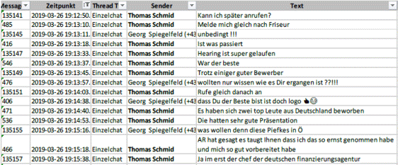 Nach dem Hearing kontaktiert Dr. Georg SPIEGELFELD-SCHNEEBURG MMag. SCHMID und erkundigt sich wie das Hearing gelaufen sei. MMag. SCHMID meint er sei, trotz einiger guter Bewerber, der Beste gewesen. Es hätten sich auch „zwei top Leute aus Deutschland beworben“, ua. auch der „Chef der deutschen Finanzierungsagentur“.