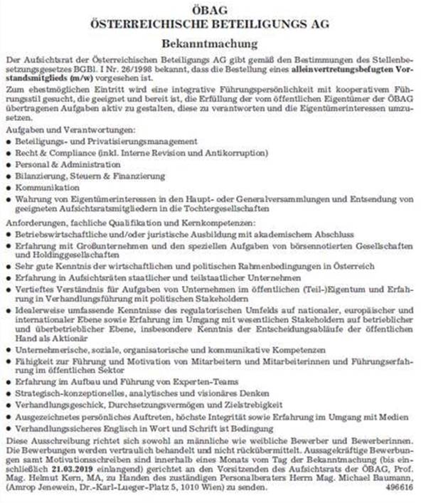 Der Generalsekretär im BMF, Thomas Schmid, und engster Vertrauter von Bundeskanzler Sebastian Kurz sucht sich – in der Rolle als oberster Beamter im BMF – zunächst „seine“ Aufsichtsräte in der ÖBAG selbst aus, führt mit allen Einzelgespräche. Danach „zimmert“ er sich als Generalsekretär eine Ausschreibung für einen ÖBAG-Alleinvorstand mit einem jährlichen Salär von 400.000 bis 600.000 Euro selbst zusammen.