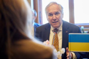 Fahnenfoto. Von rechts: Nationalratspräsident Walter Rosenkranz (FPÖ), Vizevorsitzende der Werchowna Rada der Ukraine Olena Kondratiuk