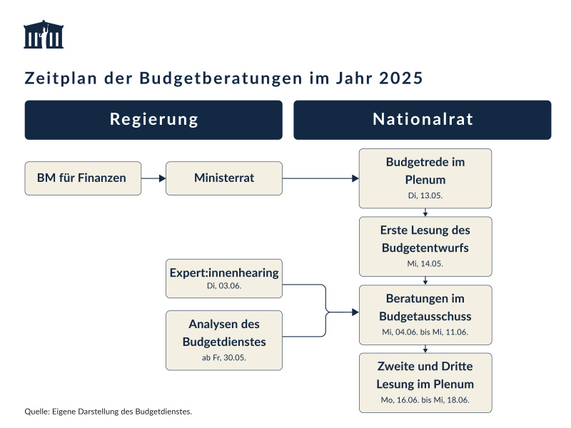Von der Budgetrede am 13. Mai bis zum finalen Beschluss am 18. Juni durchläuft der Budgetentwurf einige Stationen im Hohen Haus.