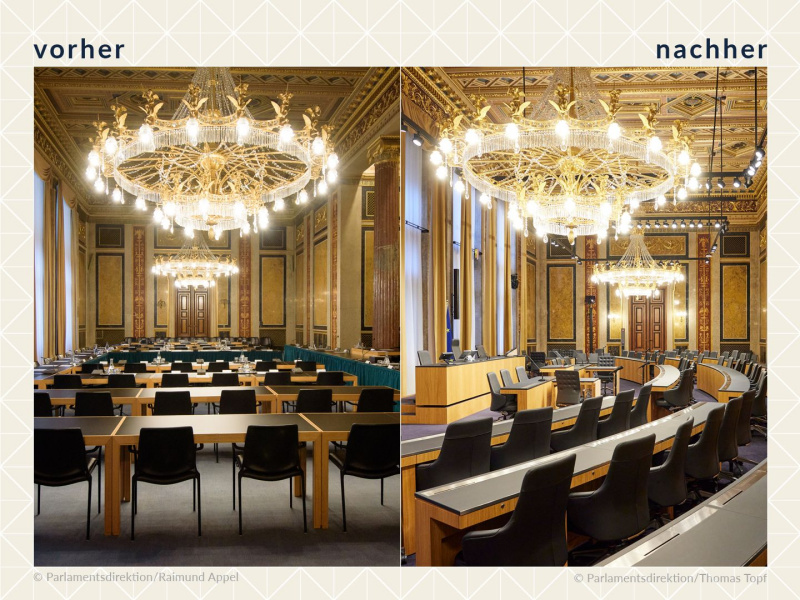 In diesem Saal mit Blick auf die Reichsratsstraße trafen sich vor der Sanierung unter anderem die Mitglieder des Budgetausschusses. Künftig finden hier die Sitzungen des Bundesrates statt.