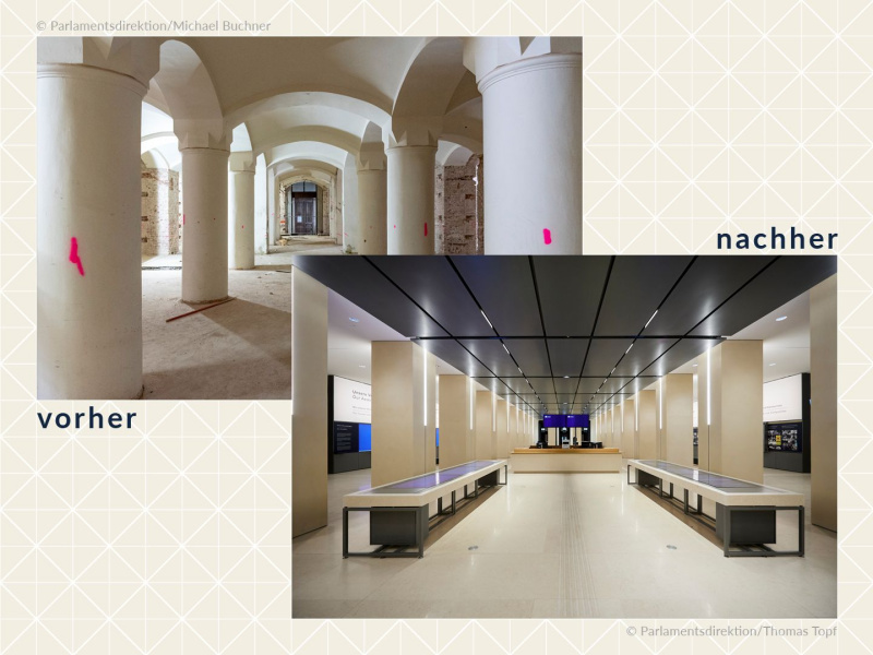 Die Agora ist Teil des neu geschaffenen Besucher:innenzentrums im sanierten Parlamentsgebäude. Zuvor wurde das Ziegelgewölbe nur als Lagerfläche genutzt und war für Besucher:innen nicht zugänglich.