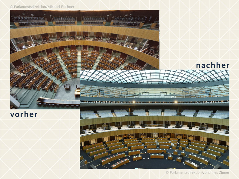 Im Nationalratssaal gibt es neben der Glaskuppel weitere wichtige Neuerungen: Der Saalboden ist künftig barrierefrei, die Abstände zwischen den Sitzreihen sind teilweise breiter und das Redner:innenpult befindet sich nun – im Gegensatz zu früher – auf derselben Höhe wie die Regierungsbank.