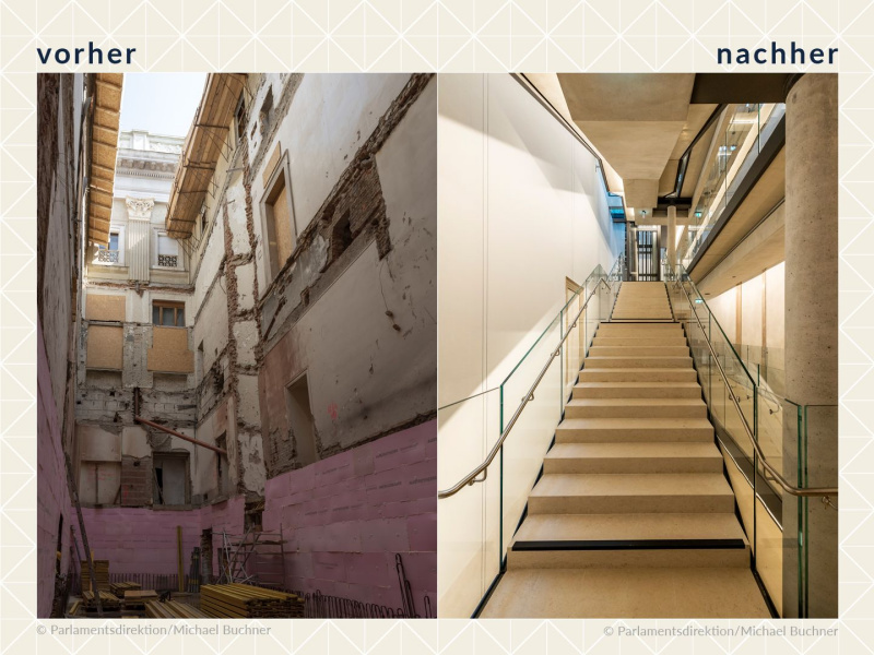 Ein wichtiges Anliegen der Sanierung war, das Parlamentsgebäude räumlich-funktional zu optimieren. Dazu gehörte unter anderem die Errichtung von vier Haupttreppen, durch die erstmals alle Ober- und Untergeschoße zentral miteinander verbunden sind und die zugleich als Fluchttreppenhäuser dienen. An ihrer Stelle befanden sich früher Innenhöfe.