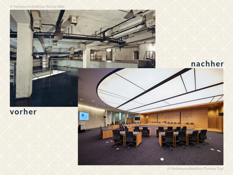 Im Lokal 1 finden künftig Fach- und U-Ausschüsse sowie Veranstaltungen statt. Das neu geschaffene Ausschusslokal liegt direkt unter dem Nationalratssaal und wurde vom Hohlraum zu einem Saal, in den 150 Personen hineinpassen, umfunktioniert.