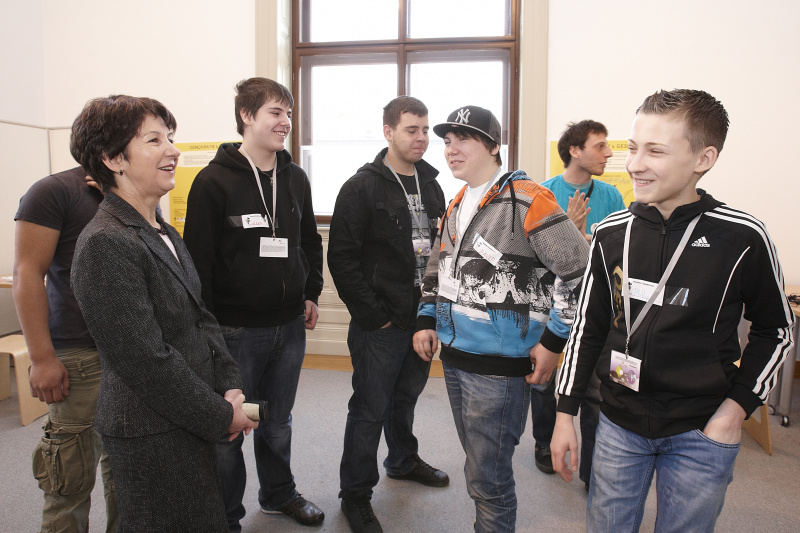 Nationalratspräsidentin Mag.a Barbara Prammer im Gespräch mit den jugendlichen Teilnehmern der Europa Werkstatt.