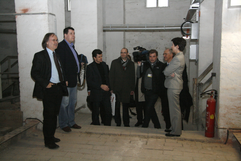 Nationalratspräsidentin Mag.a Barbara Prammer (re) und Architekt Prof. DI Dr. Sepp Frank (2.v.re) mit Medienvertretern am Dachboden des Parlaments