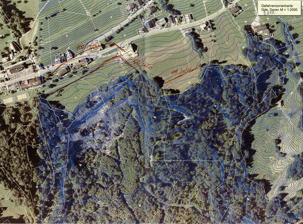 Im Zuge der Voruntersuchungen zum Projekt 2008 wurde von den von uns befassten Geologen Gefährdungsszenarien entwickelt, wie sich die Rutschung in 50 bzw. 100 Jahren weiterentwickelt, um so die Anzahl der gefährdeten Objekte und Straßen ermitteln zu können (siehe Beilage).