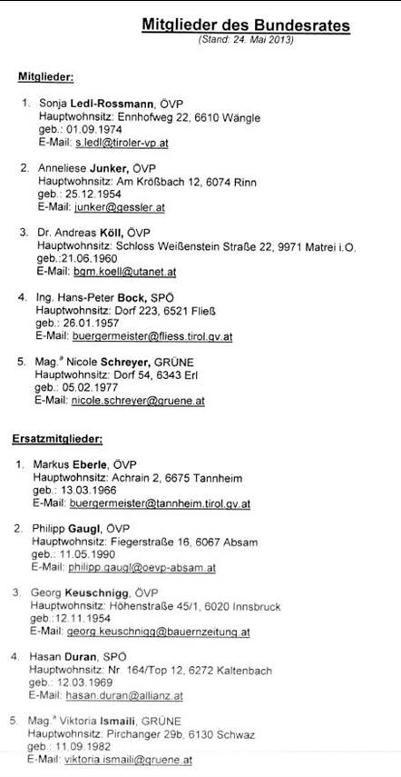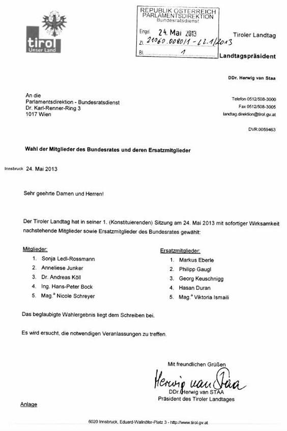 Schreiben des Präsidenten des Tiroler Landtages betreffend Wahl von Mitgliedern und Ersatzmitgliedern in den Bundesrat ................................................................................................................ 13
