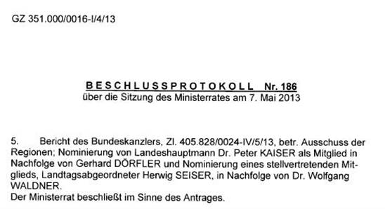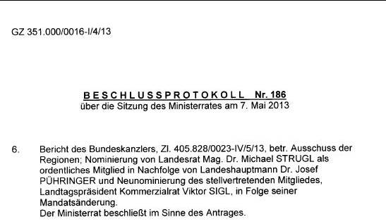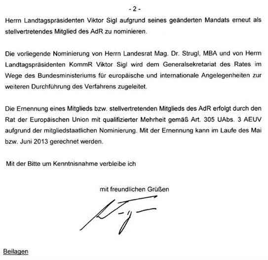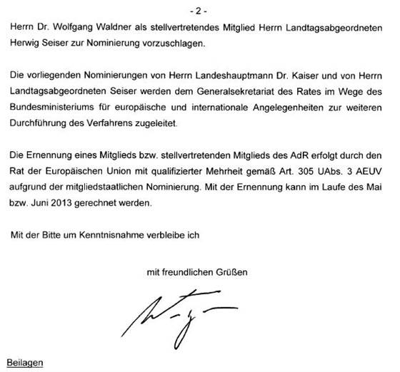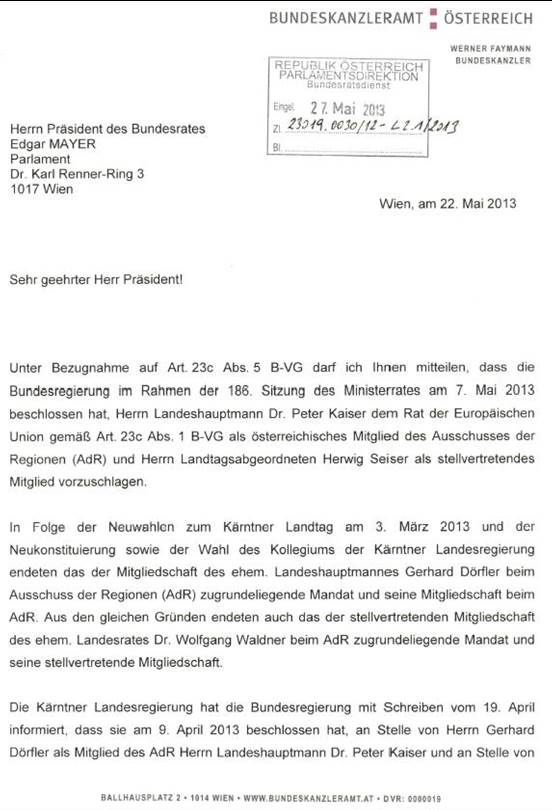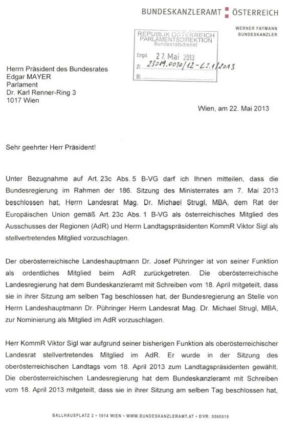 Schreiben des Bundeskanzlers gemäß Artikel 23c Abs. 5 Bundes-Verfassungsgesetz betreffend Nominierung eines Mitgliedes und eines stellvertretenden Mitgliedes in den Ausschuss der Regionen ............................................................................................................................... 41