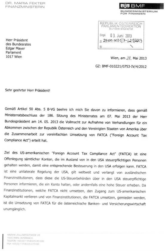 Schreiben der Bundesministerin für Finanzen gemäß Artikel 50 Abs. 5 Bundes-Verfassungsgesetz betreffend Erteilung der Vollmacht zur Aufnahme von Verhandlungen für ein Abkommen zwischen der Republik Österreich und den Vereinigten Staaten von Amerika über die Zusammenarbeit zur vereinfachten Umsetzung von FATCA („Foreign Account Tax Compliance Act“) durch den Herrn Bundespräsidenten 43