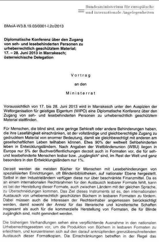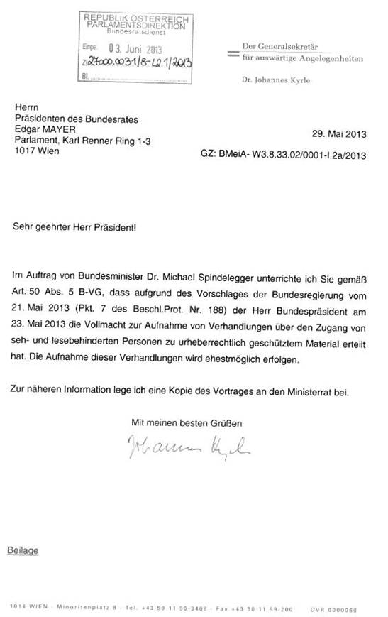 Schreiben des Generalsekretärs für auswärtige Angelegenheiten Dr. Johannes Kyrle gemäß Artikel 50 Abs. 5 Bundes-Verfassungsgesetz betreffend Erteilung der Vollmacht zur Aufnahme von Verhandlungen über den Zugang von seh- und lesebehinderten Personen zu urheberrechtlich geschütztem Material durch den Herrn Bundespräsidenten ......................................................................................................... 45