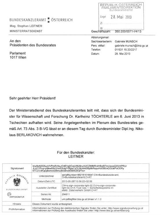 Schreiben des Bundeskanzleramtes betreffend Aufenthalt eines Mitgliedes der Bundesregierung in einem anderen Mitgliedstaat der Europäischen Union ............................................................. 48