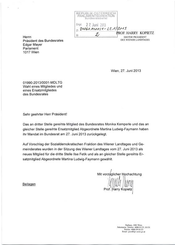 Schreiben des Präsidenten des Wiener Landtages betreffend Mandatsverzicht der Bundesrätin Monika Kemperle sowie Wahl eines Mitgliedes und eines Ersatzmitgliedes in den Bundesrat 25